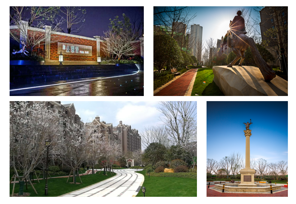 本项目景观面积大约3万平方,以欧式风格为主,主要材料为黄金麻和文化砖为主,主要树种为银杏和大香樟,其中以中轴的雕塑和樱花林为主要景观亮点。